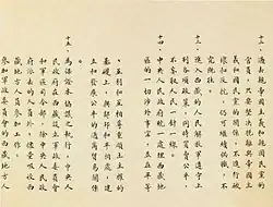 "Este año, el plenipotenciario del gobierno local tibetano, Ngapoi Ngawang Jigme y otras cinco personas, llegaron a Beijing a finales de abril de 1951 para llevar a cabo conversaciones de paz con el plenipotenciario designado por el Gobierno Popular Central. Sobre la base de la amistad, los representantes de ambas partes firmaron el acuerdo sobre medidas para la liberación pacífica del Tíbet el 23 de mayo de 1951. El gobierno local del Tíbet, así como el pueblo eclesiástico y secular, apoyan unánimemente este acuerdo, y bajo el liderazgo del Presidente Mao y el Gobierno Popular Central., apoyará activamente al Ejército Popular de Liberación del Tíbet en la consolidación de la defensa nacional, expulsará las influencias imperialistas del Tíbet y salvaguardará la unificación del territorio y la soberanía de la Patria".[14]