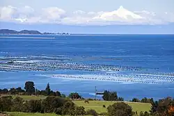El cultivo comercial del chorito o mejillón chileno se inició antes de la década de 1980, pero fue a partir de comienzos del siglo XXI que se comenzó a posicionar como la segunda industria acuícola de Chile, después del salmón.[59] El país es el segundo productor de mejillón del mundo, después de China, y el primer exportador mundial.[60] Prácticamente la totalidad de la industria mitilicultora —como es conocida— se desarrolla en la Región de Los Lagos. Se concentra en los archipiélagos de Chiloé y Calbuco, pero también tiene presencia en Puerto Montt, en el estuario de Reloncaví y en Hualaihué.