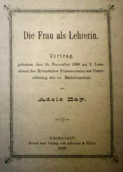 - Zay, Adele (1889). Die Frau als Lehrerin [The Woman as Teacher] (in German). Kronstadt, Hungary: Albrecht & Zillich. – via ASP: Women and Social Movements (subscription required)