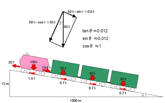 A continuación, se supone que el tren está en una rampa con una pendiente de 12 milésimas (es decir, en la que se ascienden 12 metros por cada 1000 m recorridos horizontalmente). En consecuencia, dado que la tangente de θ es 0.012, entonces θ=arcotangente(0.012)≈0.687°. Así, al tratarse de un ángulo pequeño en radianes, tan(θ) ≈ θ, sen(θ) ≈ θ y cos(θ) ≈ 1. Por lo tanto, el efecto de la gravedad sobre la locomotora de 100 t se considera descomponiendo el peso en dos componentes, una en la dirección paralela de la pendiente y la otra en la dirección perpendicular (normal) a la pendiente. En la dirección paralela, es de 100 t × sen θ = 1.2 t; y en la dirección normal es 100 t × cos θ = 100 t. A partir de esto, se puede considerar que la disminución en la carga sobre las ruedas debida a estar en la pendiente puede ser casi ignorada, y la fuerza de tracción se puede considerar 20 t, la misma que cuando la locomotora se encuentra en terreno plano. Por otro lado, el cambio en la resistencia del tren es el siguiente: la locomotora en sí tiene una resistencia de 0.2 t; a la que se deben agregar 1.2 t, debidas a la componente de la gravedad paralela a la rampa. Del mismo modo, la resistencia del tren es de 0.7 t por vagón, debido a la acción combinada de la componente de la gravedad paralela a la pendiente y a la resistencua de rodadura. Dividiendo las 18.6 toneladas que se pueden usar para remolcar un tren por 0.7 toneladas, se obtiene que el número máximo de vagones remolcable es de 26. En la práctica, la carga por eje limita el peso máximo de los vagones. Como se describió anteriormente, incluso si hay un ligero gradiente, la fuerza de tracción disponible se reduce considerablemente. Por esta razón, es importante mantener la vía lo más horizontal posible, lo que en terreno accidentado requiere utilizar túneles, desmontes, terraplenes y puentes para no reducir la capacidad de tracción.
