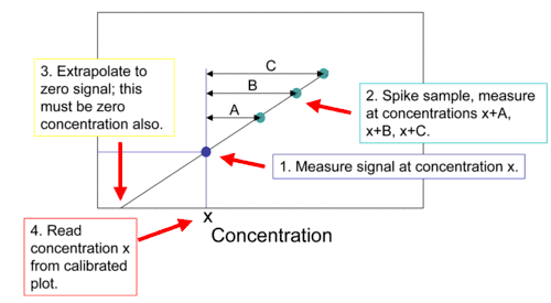 Supongamos que la concentración de plata en muestras de residuos fotográficos se determina mediante espectrometría de absorción atómica. Usando el método de la curva de calibración, un analista podría calibrar el espectrómetro con algunas soluciones acuosas de una sal de plata pura y utilizar el gráfico de calibración resultante en la determinación de la plata en las muestras de prueba. Sin embargo, este método solo es válido si una solución acuosa pura de plata y una muestra de desechos fotográficos que contienen la misma concentración de plata dan los mismos valores de absorbancia. En otras palabras, al usar soluciones puras para establecer el gráfico de calibración, se supone que no hay "efectos de matriz", es decir, no hay reducción o mejora de la señal de absorbancia de plata por parte de otros componentes. En muchas áreas de análisis, tal suposición es frecuentemente inválida. Los efectos de la matriz se producen incluso con métodos como la espectrometría de plasma, que tienen una reputación de estar relativamente libres de interferencias. El método de las adiciones estándar generalmente se sigue para eliminar los efectos de la matriz. Experimentalmente, se toman volúmenes iguales de la solución de la muestra, todos menos uno están "enriquecidos" por separado con cantidades conocidas y diferentes del analito, y todos se diluyen al mismo volumen. Las señales del instrumento se determinan para todas estas soluciones y se trazan los resultados. Como de costumbre, la señal se traza en el eje y; en este caso, el eje x se gradúa en términos de las cantidades de analito agregado (ya sea como un peso absoluto o como una concentración). La línea de regresión (no ponderada) se calcula de la manera normal, pero se proporciona espacio para que se extrapole al punto en el eje x en el que y = 0. Esta intersección negativa en el eje x corresponde a la cantidad de analito en la muestra de prueba. Este valor viene dado por b / a, la relación de la intersección y la pendiente de la línea de regresión. De manera similar, en la cromatografía de gases se utiliza el siguiente procedimiento: