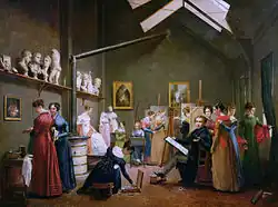 Debutó en el Salón de París de 1822 con el cuadro El estudio de Abel de Pujol; esta obra fue una de las varias imágenes del estudio de Pujol que produjo a lo largo de su carrera.[2] Inspirada por su trabajo de profesora en el estudio de Pujol, este cuadro muestra a Pujol hablando de un lienzo mientras un grupo de jóvenes estudiantes de arte lo rodean, otros trabajan en sus cuadros, seleccionan pinturas y sueñan despiertos por la ventana. "Abundan las claves didácticas apropiadas a este género, entre las que se incluyen la modelo femenina vestida y sentada en la esquina al fondo a la izquierda, copias de tres pinturas religiosas identificables de Pujol, que se especializó en ese género, y un estante de moldes de yeso con un torso desnudo masculino girado decorosamente, si bien juguetón, hacia la pared."[1]