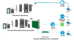 La adsorción por cambio de presión (PSA por sus siglas en inglés) es una técnica utilizada para separar algunas especies de gas de una mezcla de gases (normalmente aire) bajo presión de acuerdo con las características moleculares de las especies y su afinidad por un material adsorbente. Funciona a una temperatura cercana a la ambiente y difiere significativamente de la destilación criogénica comúnmente utilizada para separar gases. Se utilizan materiales adsorbentes selectivos (por ejemplo, zeolitas, tamices moleculares, carbón activado, etc.) como material de captura, adsorbiendo preferentemente las especies de gas objetivo a alta presión. Luego, el proceso cambia a baja presión para desorber el gas adsorbido.