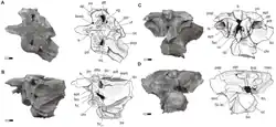 ![]() Diferentes vistas del cráneo incompleto de Aegisuchus witmeri | ||