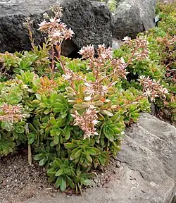Escalas cuadradas, ligeramente denticuladas, de 1 mm de ancho, 0,5 mm de long. Carpelos erectos, blancos, pubescentes, ovarios muy delgados, de 2 mm de long.; estilos erectos de 3 mm de long. teñidos de rosa. Florece en el hemisferio boreal entre abril y junio.