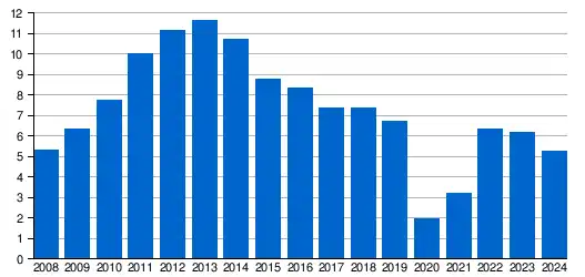 | Año | Pasajeros | Cambio | Pasajeros totales 2008–presente (en cientos de miles) |