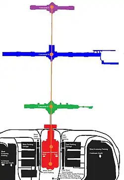 La terminal se divide terminales este y oeste para recogida y dejada de pasajeros. A continuación se ofrece un mapa de las líneas aéreas asociadas a las terminales.