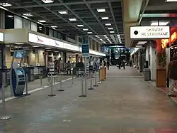 Varios servicios de alimentos y bebidas, incluido el restaurante Tim Hortons y White Spot Legends, quioscos de prensa (Skyway Gifts y News) y tiendas minoristas relacionadas con el turismo (Okanagan Estate Wine Cellar), además de una selección limitada de productos libres de impuestos (Okanagan Style y Duty Free), se pueden encontrar en la terminal. La sala de embarque cuenta con un centro de negocios por cable e internet inalámbrico de cortesía. El punto focal del aeropuerto es una rotonda de vidrio que contiene una fuente y la escultura cilíndrica de vidrio "Escape from Stella Polaris" y el Skyway Atrium Lounge. Kelowna Art Gallery opera un sitio satelital en el aeropuerto. Una pequeña área de observación se encuentra en el entresuelo.