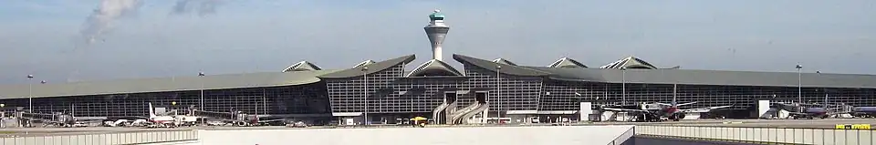 - La Terminal Principal y la Terminal Satélite están conectadas por el Aerotrain, un tren de tres vagones sin conductor que corre sobre un riel elevado y bajo las calles de rodaje con un intervalo de entre tres y cinco minutos. El viaje entre terminales insume menos de dos minutos, y cada tren con capacidad para 250 personas es capaz de transportar 3,000 pax/h por dirección a una velocidad máxima de 56 km/h. Este es un servicio complementario para todos los pasajeros que se desplazan desde y hacia la Terminal Satélite.