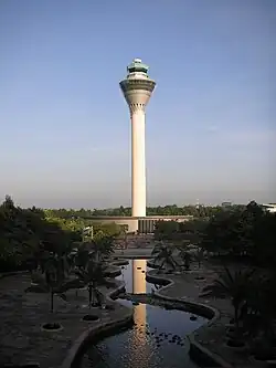 La torre de 130 m de altura es en la actualidad, la segunda torre de control aéreo más alta del mundo, detrás de la del Nuevo Aeropuerto Internacional de Bangkok. Tiene la forma de una llama olímpica y alberga los sistemas de control del tráfico aéreo y el equipamiento de radar.