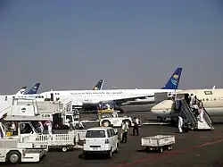 Vista de plataforma y llegadas internacionales. A la vista un Turkish Airlines regular procedente de Estambul, con charters para el Hajj de Uzbekistan Airways, Sudan Airways, Egypt Air y Saudia al fondo.