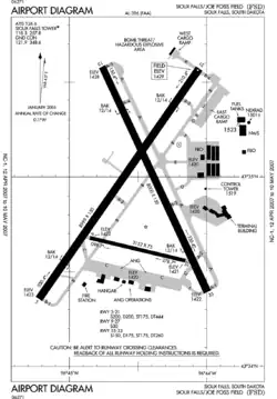 - ↑ a b c d Registro principal de la FAA para el FSD (Forma 5010 PDF). Administración Federal de Aviación. Efectivo 28 de noviembre de 2024.