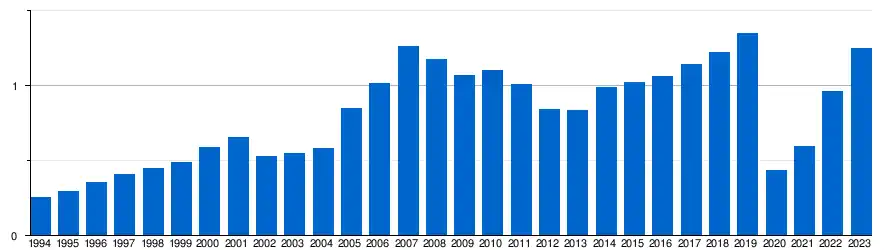 | 1.068.823 | 1.101.208 | 1.012.800 | 845.452 | 839.837 | 988.834 | 1.025.688 | 1.063.291 | 1.141.242 | 1.225.763 | 1.352.583 | 436.765 | 594.584 | 963.957 | 1.252.022 |