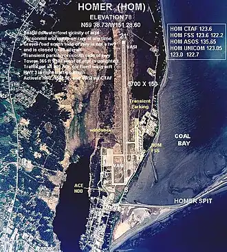 El Aeropuerto de Homer cubre un área de 421 ha con una elevación de 26 metros sobre el nivel del mar. Tiene una pista designada 3/21 con 2.042 x 46 m con pavimento de asfalto,[1] y un embarcadero de hidroaviónes junto al lago Beluga.