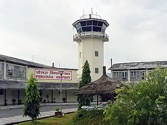 Se encuentra a sólo 2 km del centro de la ciudad, por lo que es posible acceder a pie desde muchas zonas de la misma. La mayoría de turistas extranjeros que llegan a Pokhara lo hacen a través de este aeropuerto, llegados desde el Aeropuerto Internacional de Katmandú.
