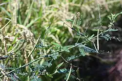 Es un subarbusto anual, que alcanza un tamaño de 30-90 cm de altura, tallo glabro, ramas cilíndricas con excreciones glandulares-espinosas similares. Hoja de 3,5-9,0 cm de largo, raquis con excreciones glandulares como espinas. Folikolos 21-71, alternos, subsésiles, en superposición, lineales, obtusos, mucronados, glabros. Inflorescencia en racimo axilar con 1-4 flores, con pedúnculo de 2.5 cm de largo, pedúnculo y pedicelo glandular, viscosa, pedicelo 5-9 mm de largo. Brácteas de 2 mm de largo. Corola de 9-10 mm de largo, de color amarillo. La fruta de 2.5 a 4.5 cm de largo, 3-5 mm de ancho, ligeramente curvada, 6-10 articulaciones, glabras o ligeramente peludas, que se separa fácilmente en partes con 1 de semilla.[3]
