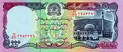 5000 afganis Violeta 5000 AFGHANIS - افغانۍ ۵۰۰۰ - Mezquita de Pul-e Khishti en Kabul - Escudo de armas - د افغانستان بانک 5000 AFGHANIS - افغانۍ ۵۰۰۰ - Mezquita - Da Afghanistan Bank