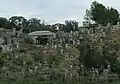 Se encontraron lápidas para las que se utilizaron grandes losas de río de hasta un metro de longitud, la mayoría de ellas datan del siglo XII, en menor medida del XIII y escasamente del XIV. Cada lápida llevaba una inscripción grabada en árabe y mostraba el nombre de la persona enterrada y el año del entierro; algunas de las piedras estaban decoradas con arabescos. En una de las piedras no había ninguna inscripción, sólo el perfil grabado de una cabeza con una corona almenada, como aparece en las monedas de Bukhar-Khudats. En el otro extremo de la piedra estaban grabados un elefante y un pájaro.[5]