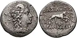 ![Símbolo de la colina arqueada coronado por una estrella. Leyenda karosti Akathukreyasa "Agathocles". Árbol enrejado, leyenda Kharoshthi Hirañasame.[23][24]](./Agatocles_Chaitya.jpg)