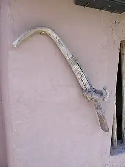 - Chaquitaclla,[23] un arado de pie de propulsión humana que consiste en un palo de madera con una punta curva y afilada, a menudo hecho de piedra o metal. En el extremo de este poste corría otro travesaño de madera, en el que el labrador puede poner su pie para hundirlo en la tierra y producir un surco.[24] Esta herramienta todavía se utiliza en los Andes para arar, sembrar y construir.[25]