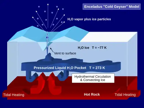 Encélado, una luna de Saturno, posee géiseres de agua, confirmados por la nave espacial Cassini-Huygens en 2005 y analizados más profundamente en 2008. Los datos gravimétricos de los sobrevuelos de Cassini en diciembre de 2010 mostraron que Encélado probablemente tiene un océano subterráneo de agua debajo de su superficie congelada, pero en ese momento se pensó que el océano estaba limitado al polo sur.[46][47][48][49] La parte superior del océano probablemente se encuentra debajo de una gruesa plataforma de hielo de 30 a 40 kilómetros (18,6 a 24,9 mi). El océano puede que tenga 10 kilómetros (6,2 mi) de profundidad en el polo sur.[46][50] Si bien anteriormente se creía que estaba localizado en una parte del hemisferio sur,[51] la evidencia revelada en 2015 ahora sugiere que el océano subterráneo es de naturaleza global.[52]