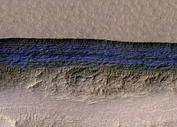 En julio de 2018, científicos de la Agencia Espacial Italiana informaron de la detección de un lago subglacial en Marte, 1,5 kilómetros (0,9 mi) debajo de la capa de hielo del polo sur, que se extiende 20 kilómetros (12,4 mi) horizontalmente, la primera evidencia de un cuerpo estable de agua en el planeta.[28][29] Debido a que la temperatura en la base del casquete polar se estima en 205 Kelvin (−68,2 °C), los científicos asumen que el agua puede permanecer líquida debido al efecto anticongelante de los percloratos de magnesio y calcio.[28][30] La capa de hielo de 1,5 km que cubre el lago está compuesta de hielo de agua con una mezcla de 10 - 20 % de polvo y cubierta estacionalmente por una capa de hielo de CO2 de 1 m.[28]