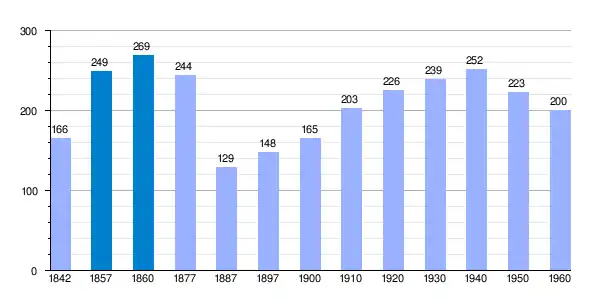 | Gráfica de evolución demográfica de Aguilar de Montuenga[5] entre 1842 y 1960 |