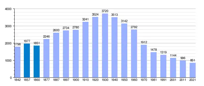 Aunque llegó a tener más de 3000 habitantes según algunos historiadores y demógrafos, sufrió una emigración en los años 1960 tan grande como el éxodo que sufren en la actualidad los pueblos pequeños hacia las grandes ciudades, por lo que su media de edad es muy alta, es decir, con pirámide poblacional invertida. En 2016 era de 934 habitantes según el INE.[5] lo que da buena muestra del éxodo antes citado.[6]