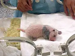 Cría de panda de aproximadamente una semana de edad en una incubadora del CIR Chengdu.