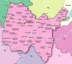 - Bresse, una llanura entre el río Saona al este y el Macizo del Jura al oeste.