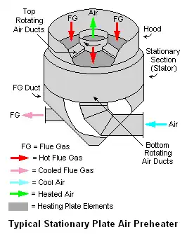 En este tipo de precalentador de aire regenerativo, los elementos de la placa calefactora también están instalados en una carcasa, pero los elementos de la placa calefactora son fijos y no giratorios. En su lugar, los conductos de aire del precalentador se giran para exponer alternativamente secciones de los elementos de la placa calefactora al aire frío ascendente. Como se indica en el dibujo adyacente, hay conductos de aire de entrada giratorios en la parte inferior de las placas estacionarias similares a los conductos de aire de salida giratorios en la parte superior de las placas estacionarias. Los precalentadores de aire regenerativos de placa fija son también conocidos como precalentadores Rothemuhle, fabricados desde hace más de 25 años por Balke-Dürr GmbH de Ratingen, Alemania.