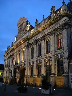 La imponente fachada del edificio es atravesada por dos puertas centrales que dan acceso a una escalera y al pasaje de Hallettes (que permite el acceso a la calle de Saint-Omer y aloja desde 1891 a la biblioteca municipal). El segundo nivel tiene once grandes aberturas, tres en el centro y cuatro en cada ala, separadas por diez pilastras que tiene una barandilla ricamente esculpida. La imponente fachada se deprende de la parte central del edificio, donde lleva el escudo de la ciudad, y se encuentra flanqueado por dos estatuas que representan a la fuerza y a la justicia. El hall en el primer piso se convirtió en un pasillo y donde se celebran los casamientos. El Ayuntamiento fue declarado monumento histórico en 1947.[21]