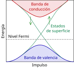- ↑ Hsieh, D.; Qian, D; Wray, L; Xia, Y; Hor, YS; Cava, RJ; Hasan, MZ (2008). «A topological dirac insulator in a quantum spin Hall phase». Nature 452 (9): 970—974. Bibcode:2008Natur.452..970H. PMID 18432240. arXiv:0902.1356. doi:10.1038/nature06843. Archivado desde el original el 23 de diciembre de 2009. Consultado el 25 de marzo de 2010.