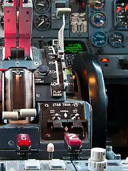 El ajuste del estabilizador libera al piloto de ejercer una fuerza constante sobre los controles de inclinación, ajustando el control de ajuste (a menudo en forma de rueda vertical) para cancelar las fuerzas de control para una determinada velocidad aerodinámica y distribución del peso.[8] Normalmente, cuando se gira esta rueda hacia arriba (o se levanta la palanca), la nariz del avión se inclina hacia abajo; al girarla hacia abajo (o presionar la palanca) baja el estabilizador de la cola y se eleva la nariz del avión.[7][8][10]