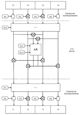 ![]() Procedimiento de encriptación del algoritmo Akelarre | ||