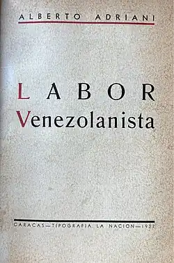 Adriani nunca escribió un libro para su publicación, pero sus trabajos fueron publicados en diarios y revistas de Venezuela y el extranjero. Al cumplirse un año de la muerte de Alberto Adriani, sus amigos Arturo Uslar Pietri y Diego Nucete Sardi recopilaron sus principales trabajos en libro titulado: «Labor Venezolanista». — Narciso Parra[15]