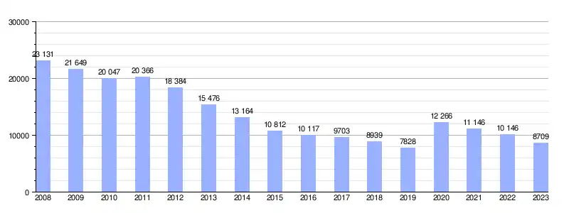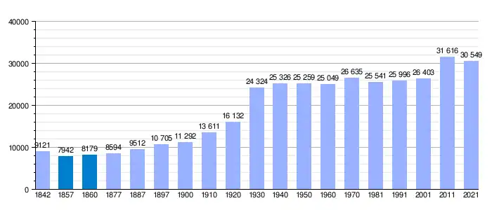 | Gráfica de evolución demográfica de Alcázar de San Juan[10] entre 1842 y 2021 |
