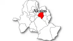 La palabra “Alcains” deriva del árabe: “la iglesia” e según algunos historiadores tiene la misma origen que Alcañiz, ciudad española de la provincia de Teruel.