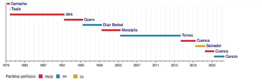 | 5-5-2016 | 15-6-2019 | Francisco Cuenca Rodríguez | Investido tras la dimisión del anterior alcalde con los votos de su grupo, el PSOE, y los de Podemos, IU y Ciudadanos. | ||