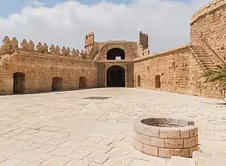Es un amplio lugar que corresponde a lo que fue campamento militar y refugio para la población en caso de asedio, que se dividía en dos barrios, y un pequeño cementerio.[16] Contaba con buenos aljibes, de los cuales hoy podemos ver uno en ruinas al descubierto, y uno de los pozos que se utilizaban para subir el agua una altura de 70 metros.[17] La entrada se realiza por la llamada Torre de los Espejos,[18] que aloja la Puerta de la Justicia.[7] Según la tradición, en esta torre existía un sistema de espejos cuya misión era hacer señales a los barcos que llegaban al puerto, esperando contestación, y descubriendo así a los enemigos.[19] En el extremo más oriental está el Baluarte del Saliente, que hoy aloja las oficinas del monumento.