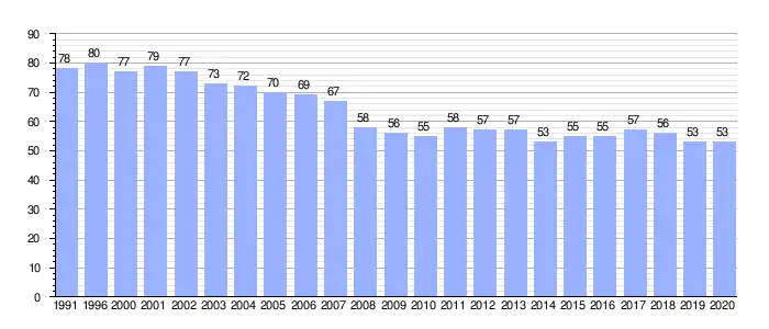 | Gráfica de evolución demográfica de Aldarís entre 1991 y 2020 |