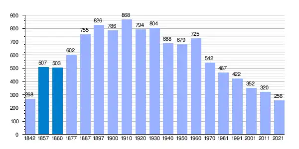 | Gráfica de evolución demográfica de Aldeaseca de la Frontera[6] entre 1842 y 2021 |