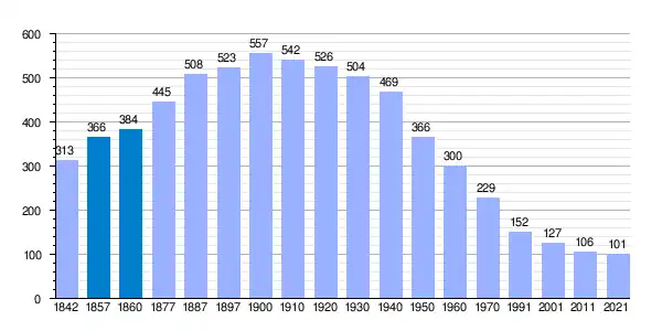 | Gráfica de evolución demográfica de Aldeavieja de Tormes[7] entre 1842 y 2021 |
