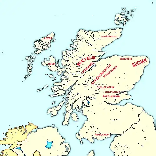 Según un mapa del libro Early Stewart Kings, (Boardman), p. 87 e información de Annals of the Parish and Burgh of Elgin, p. 102 (Young)