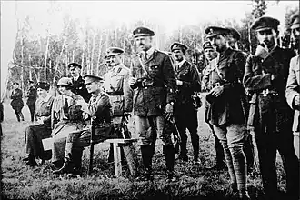 Para ganarse el favor de los aliados y de la opinión pública extranjera la dictadura mantuvo una continua propaganda a favor de la democracia, de escasa credibilidad en la zona.[98] También como gesto a los aliados, el nuevo régimen se comprometió al pago de la enorme deuda exterior rusa,[99][100] que había sido rechazada por el Gobierno bolchevique.[98] La misión militar británica se convirtió en uno de los pilares fundamentales del nuevo régimen siberiano de Kolchak.[101][100] El general Knox quedó como responsable de las unidades de la retaguardia mientras que el general francés Maurice Janin mandaba las tropas extranjeras del frente[102] (21 de enero de 1919).[103][80] Los británicos se convirtieron en el primer suministrador de armas y dinero para el régimen de Kolchak.[100][104] Dada la pronta retirada de los checoslovacos del frente para pasar a vigilar el Transiberiano[102] a comienzos de 1919, el mando y la influencia de Janin quedaron en puramente nominales frente a los de Knox.[80]