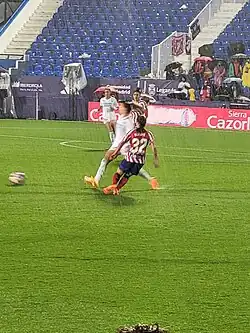 En la temporada 2023-24 pasó a formar parte del primer equipo,[23] donde apenas tuvo minutos y jugó varios encuentros con el filial y ayudó a que mantuviesen la categoría. Con el primer equipo cayeron eliminadas en la semifinal de la Supercopa y llegaron a la semifinal de la Copa de la Reina. Lograron el objetivo de clasificarse para la Liga de Campeones tras ser terceras en liga.[24]