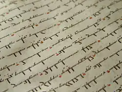El nusjuri apareció por primera vez en el siglo IX como variante gráfica del asomtavruli.[6] La inscripción más antigua data del 835 y está en la iglesia de Ateni Sioni.[16] Los manuscritos más antiguos que se han encontrado en nusjuri datan del año 864.[17] Este alfabeto adquirió predominancia sobre el asomtavruli a partir del siglo X.[15]