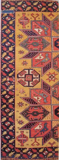 - ↑ Herrmann, Eberhart (1988). Seltene Orientteppiche/Rare Oriental Carpets Vol. X (1st edición). Munich: Eberhart Herrmann. p. 39. ISBN 3-923349-60-2.