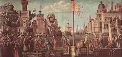 También se solían colgar sobre balaustradas o fuera de las ventanas para ocasiones festivas, como las procesiones a través de Venecia que muestran en sus obras Vittore Carpaccio o Gentile Bellini; cuando la Santa Úrsula de Carpaccio se embarca, las cuelgan sobre los costados de las embarcaciones y puentes peatonales.[23]
