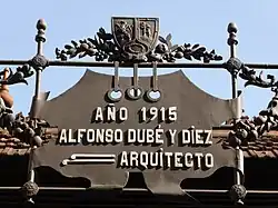 Rótulo con el nombre del arquitecto autor del Mercado de San Miguel, y fecha de su construcción en 1915. | ||